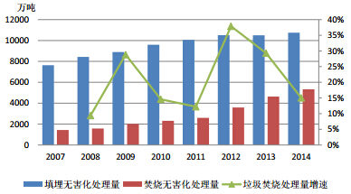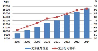 2007-2014年生活垃圾无害化处理量以及无害化处理率
