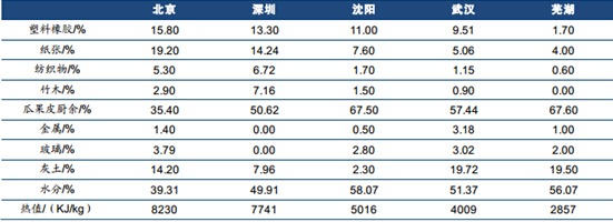 不同城市生活垃圾组分以及热值对比: