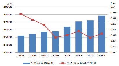 2007-2014年城镇垃圾清运量以及人均每日垃圾产生量