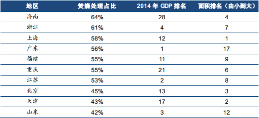 焚烧占比高的地区都是经济发达地区或面积较小地区