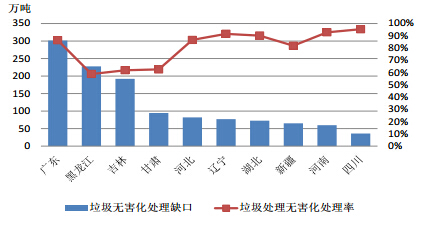 2014 年各省生活垃圾无害化处理缺口及无害化处理率