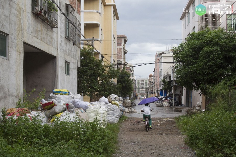现今,由于贵屿循环经济工业园可容纳的厂家数量有限和比园外租金昂贵等问题,园外依旧有少量的私人作坊存在,游走在产业的“灰色地带”。图为6月2日,贵屿循环经济产业园区外,一名男孩撑着雨伞骑车经过私人作坊。