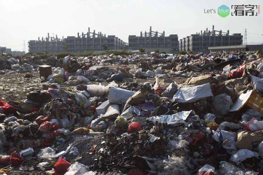 一直以来,当地政府对贵屿的污染问题多次明令禁止:不能用直接加热的办法拆解线路板,不能用酸洗提炼贵金属,不能焚烧电子垃圾。然而,禁令并未能阻止污染持续发生。直到2012年,一项专门制定的《汕头市贵屿地区电子废物污染综合整治方案》颁布,电子垃圾产业对贵屿镇造成的环境污染等问题开始受到官方的广泛重视。图为2016年6月2日,贵屿,工业园后的垃圾场堆放着电子垃圾和生活垃圾,紧挨着农田。