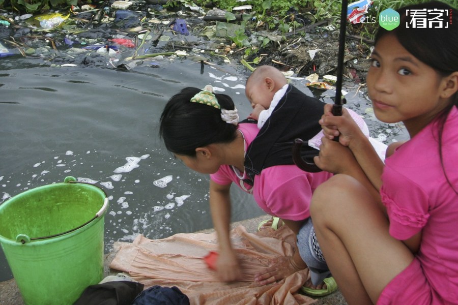 随着电子垃圾产业在贵屿快速发展,当地河流遭遇了严重污染,民众生活用水成了头号难题。当地居民需要在“黑河”边洗衣服,回家后再用井水过滤一遍。图为2005年12月13日,一名打工女子背着婴儿在“黑河”边洗衣服,另一位女孩为她撑伞挡雨。