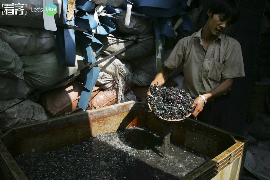 上个世纪90年代开始,长期贫困的贵屿涉足了废旧电子产品的拆解生意,规模逐渐扩大,形成了从回收、拆解、加工和销售电子垃圾的完整产业链。至2005年,贵屿全镇从事电子垃圾处理行业的家庭作坊5500户,从业人员达6万多人,年产值近10亿元,占全镇工业总产值的90%以上,上缴税收1000万元。电子垃圾成为了贵屿支柱产业和当地居民最主要的经济来源。图为2005年,电子垃圾作坊的工人从污水中捞出废品。