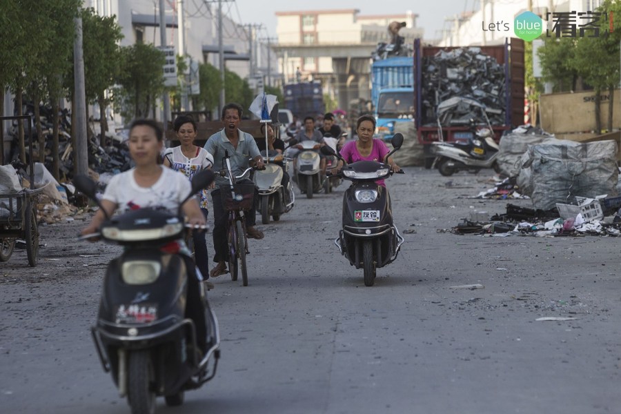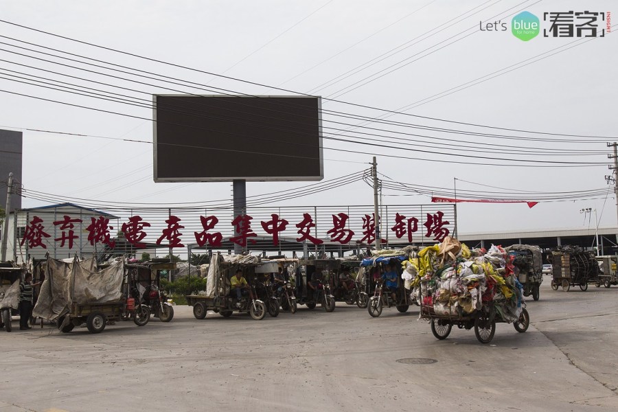 在贵屿,电子垃圾产业的工作机制已经非常专业,每一家工厂一般只负责拆解回收或者加工某几种特定的材料,如电路板、塑料、铜、铝等,拆解完成后的其他材料,会卖给二级作坊或者工厂。在这种较为成熟的运作模式下,电子垃圾的转运量非常大,为搬运工和三轮摩托货运车主提供了市场。 图为2016年6月5日,贵屿循环经济产业园区,一群搬运工在废弃机电产品装卸场外等待雇主。