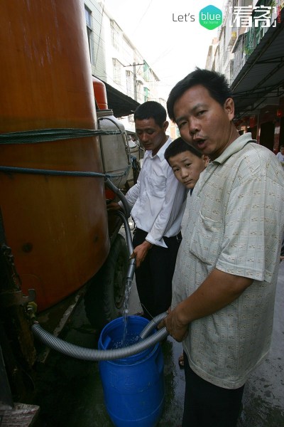 实际上,当地的地下水也不能饮用,刚打上来的井水是干净的,但很快就会变成褐红色。当地除小部分人装了从别处引来的自来水外,大部分人靠从流动水车买干净水来饮用。同时,肾结石成为当地最常见的疾病之一。早在2003年,“绿色和平”组织联合中山大学就对贵屿的产业规模、生态环境和劳务关系等进行了一次大型调研。报告称,由于重金属超标,当时贵屿绝大多数的地表水和浅层地下水都已不能饮用,加之自来水覆盖范围非常窄,当地民众需要买水饮用。运水业也因此成为当地重要的行业之一。图为2005年,贵屿镇居民在流动的运水车前买水。