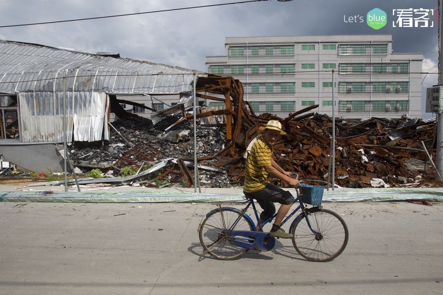贵屿的周边都是丘陵地区,烘烤电路板、焚烧垃圾等产生的有害气体和悬浮物,难以通过空气的自然流动而散去,因而导致整个贵屿地区的空气质量非常差。其中造成的一个严重危害是,那些抵抗力较弱的儿童成为呼吸道疾病最大受害人群之一。 图为2016年6月4日,贵屿循环经济产业园区,一名下班的工人骑车走过废弃的厂房。