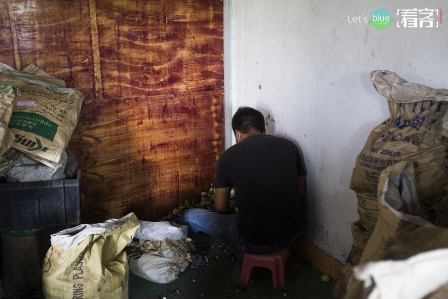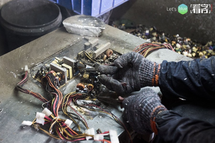 实际上,贵屿本地的老板和外地工人之间又是相互依赖的关系。由于担心健康问题,极少贵屿本地人愿意从事拆解工作,外地人几乎承担了所有的身体伤害。而本地的老板需要付给外来人一份并不算高的工资,成为他们的主要收入来源。图为2016年6月5日,贵屿循环经济产业园区,当地一名工厂的老板在一旁看管工人工作。