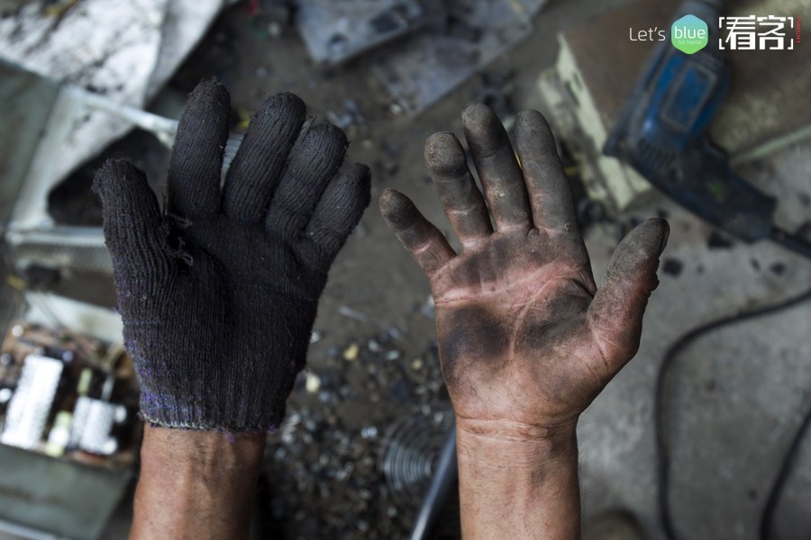 废旧的电路板上有镀金、铜骨架等各种“值钱”的金属。 然而,提取黄金的工序目前主要在郊外的工厂进行,且这种生产极为隐蔽,外人很难接近。图为6月5日,贵屿循环经济产业园区,工人的手掌沾满油污,手套也被染黑。