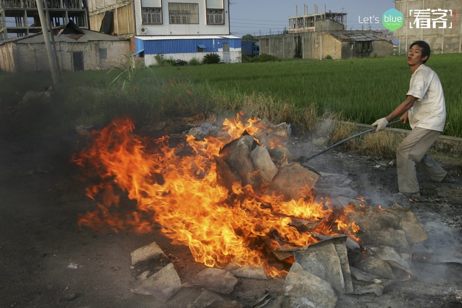 根据“绿色和平”组织的调查取样,包括铅、镉、汞、六价铬、聚氯乙烯塑料、溴化阻燃剂在内的六项有害物资已经渗入到当地的土壤和地下水中。图为2005年,贵屿,一名工人在田地边焚烧无用的塑料垃圾,燃起熊熊烈火。
