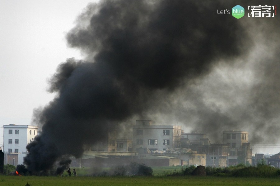 曾经被电子垃圾包围的贵屿,大量的田地被废弃,用来做厂房、仓库或电子垃圾堆放处。在未整治之前,每天到了傍晚时分,贵屿的田地上都会升起滚滚黑烟。据悉,黑烟是工人焚烧电子板等电子垃圾引起的,为的是将其中的金属取下来。图为2005年12月,贵屿,田地上有人在焚烧电子垃圾,黑烟滚滚。