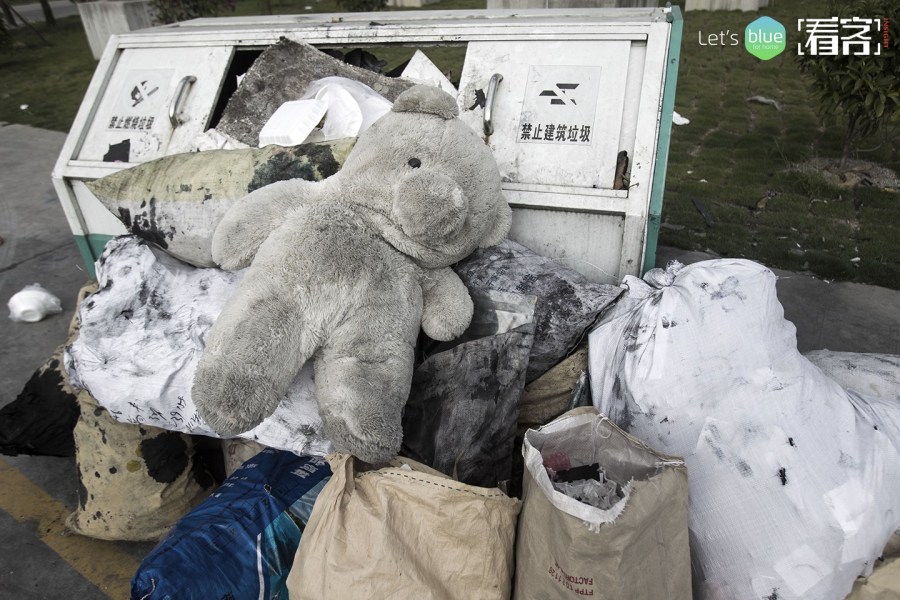 有份针对贵屿地区空气成分的调查结果显示,当地空气中多溴联苯醚的浓度为21.5纳克每立方米,分别是香港和广州地区的140倍和70倍。此外,调查还检测到氯代二恶英和溴代二恶英两种有害气体。图为2016年6月1日,贵屿循环经济产业园区,一只白色的布娃娃已经被染黑,丢弃在垃圾堆上。