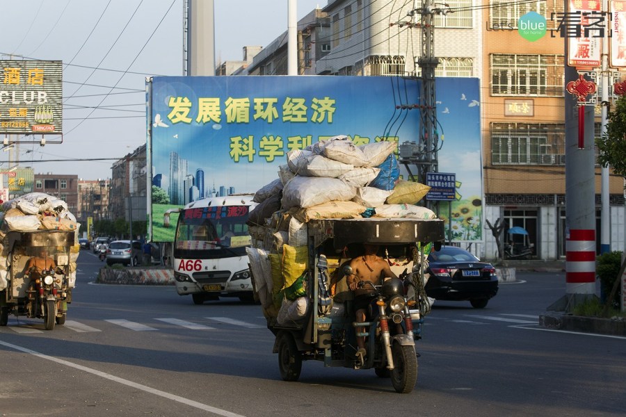 电子垃圾产业的发展成熟,极大地提高了贵屿本地人的经济收入和消费水平,第三产业也得到了较好的发展。走在贵屿的路上,随处可见挂着本地车牌的进口私家车,主街道也呈现出一片繁华景象。图为2016年6月4日,贵屿循环经济产业园区,园区的宣传板被工厂拿来遮挡货物。