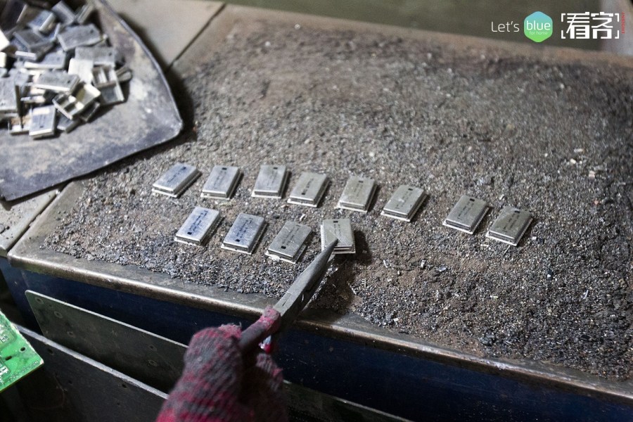 待电路板拆解完成后,会有专门的工人进行分类。之后工厂老板会根据自己的需求,自行处理掉一部分金属,剩下的部分会卖给二级作坊和工厂来做进一步的处理。图为2016年6月2日,贵屿循环经济产业园区,工人用小型电热器融化金属锡,撒上一层煤灰之后烘烤电子器件,再用钳子拆解。