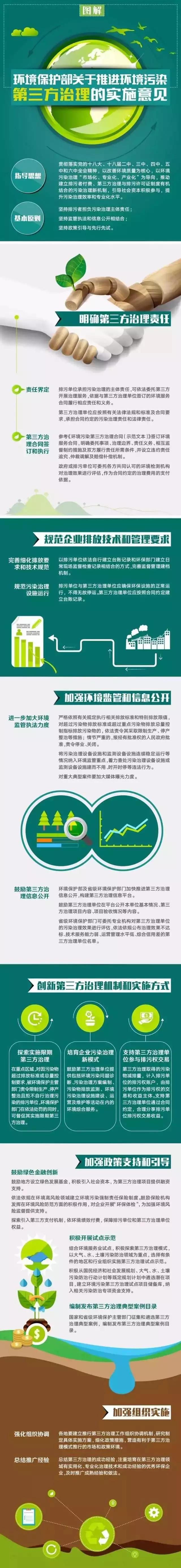 自2014年国务院出台《关于推行环境污染第三方治理的意见》以来,各地区、有关部门在环境污染第三方治理方面进行了积极探索,取得初步成效。为加快推进和规范环境污染第三方治理,近日,环境保护部发布了《环境保护部关于推进环境污染第三方治理的实施意见》,围绕明确第三方治理责任、规范企业排放技术和管理要求、加强环境监管和信息公开、创新第三方治理机制、加强政策支持等方面提出了实施意见。