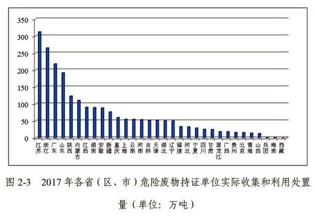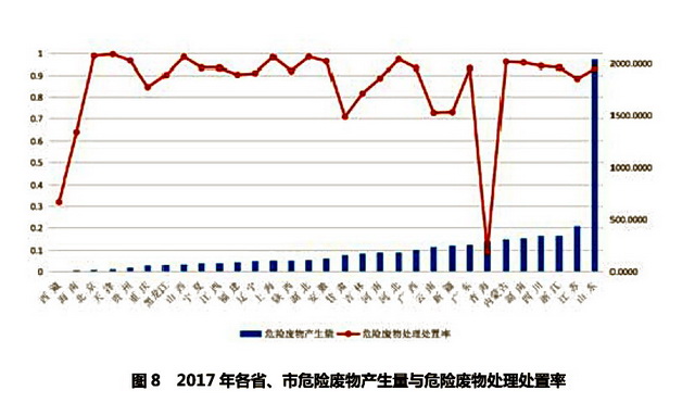 统计数据显示,2017年,山东省工业危废产生量为2043.40万吨,居全国首位,占全国产量比29.34%。江苏省(435.52万吨)、浙江省(342.26万吨)产生量紧随其后,分别占全国产生量的6.3%和4.9%。处置量前三分别为内蒙古、山东、江苏,分别占全国处置量的15.5%、11.6%、9.5%。